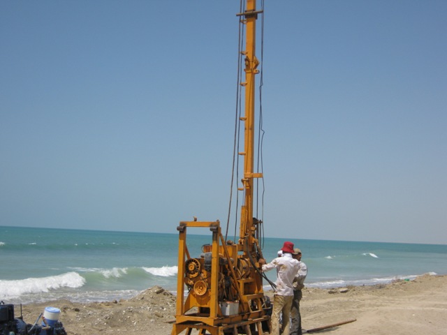 جهت انجام مطالعات ژئوتکنيک در ساختگاه موج شکن بيردف به دو روش زير اقدام گرديد: الف) عمليات نمونه برداري در خشکي: جهت عمليات حفاري در ساحل خشکي دريا از يک دستگاه حفاري اکر (Acker) با قابليت حفاري در مصالح آبرفتي و سنگ استفاده گرديده است. به همراه دستگاه حفاري فوق کليه لوازم نظير پمپ آب پيستون 140 ليتري و ابزار آلات حفاري شامل راد و کي سينگ و وسايل مربوطه جهت حفاري تا عمق حداکثر 40 متر بوده است. ب) عمليات نمونه برداري از بستر دريا: سيستم انتخاب شده جهت انجام نمونه برداري از بستر دريا به نحوي انتخاب شده که شرايط ذيل را تأمين نموده است: - امکان مونتاژ و دمونتاژ با حداقل امکانات - به آب اندازي و خارج کردن سريع از داخل آب - امکان شناسايي تا عمق 3 متر - پايداري در مقابل نيروهاي ناشي از عمليات نمونه گيري داخل آب با استفاده از لنگرهاي مناسب و استفاده از لوله جدار تا کف بستر. با توجه به موارد فوق الذکر يک سطحه شناور در نظر گرفته شده که بوسيله لنگرهايي در جاي خود ثابت نگهداشته مي شود. امکان مونتاژ و دمونتاژ سطحه مورد نظر با توجه به سبک بودن آن مزيت اصلي اين روش مي باشد. جهت جابجايي اين سطحه از يک شناور مناسب استفاده مي گردد. با توجه به عمق نمونه برداري مورد نظر، ارتفاع دکل در نظر گرفته براي اين سطحه شناور به نحوي است که امکان اخذ نمونه را بوسيله نمونه گيرهاي مختلف فراهم مي نمايد. ميزان فرو رفت نمونه گير و توصيف ظاهري نمونه در محل انجام مي شود و نمونه هاي اخذ شده، از هر محل بسته بندي شده و جهت انجام آزمايش هاي آزمايشگاهي ارسال مي گردد. جهت تهيه نمونه از يک چکش به وزن حدود 60 کيلوگرم استفاده مي گردد.